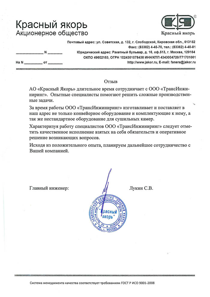 Отзыв от АО «Красный Якорь»06 октября 2017 АО «Красный Якорь» длительное время сотрудничает с ООО «ТрансИнжиниринг». Опытные специалисты помогают решить сложные производственные задачи. За время работы ООО «ТрансИнжиниринг» изготавливает и поставляет в наш адрес конвейерное оборудование и комплектующие к нему, а так же нестандартное оборудование для сушильных камер. Характеризуя работу ООО «ТрансИнжиниринг» следует отметить качественное исполнение взятых на себя обязательств и оперативное решение возникающих вопросов. Исходя из положительного опыта, планируем дальнейшее сотрудничество с вашей компанией.